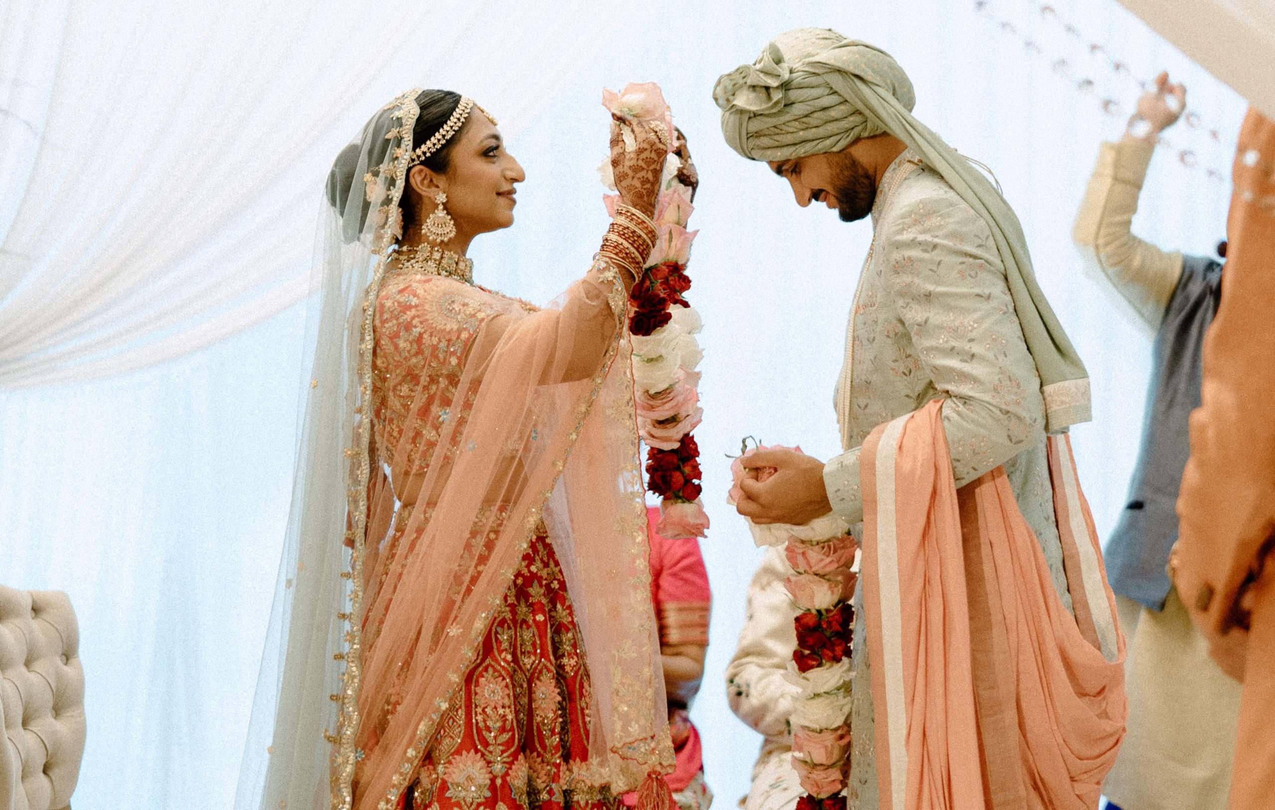 The Jaimala ceremony or the garland exchange ceremony is a ritual between the bride and groom. The bride in her gorgeous Rajasthani bridal lehenga choli steps into the wedding mandap for Jaimala. The bride and groom in their impeccable wedding ensembles vow to be with each other for saath Janam.