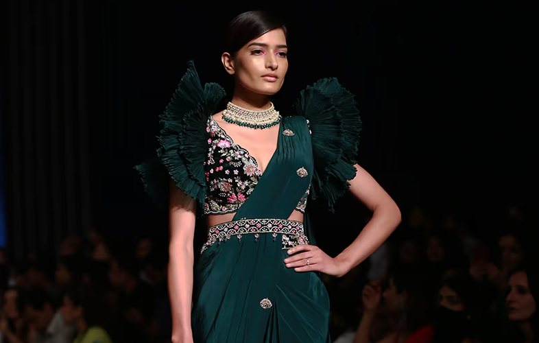 Sarees never come to your mind when you think of a chic silhouette. Well, Indian designers have pushed the envelope and transformed the saree in such a way that it looks like an outfit, a quirky dress, a sassy number, and a dramatic drape. We are talking about a big hit in current fashion ruffle sarees. The ruffle drape not only looks modern but mixes with traditional attire in a classic way. Age-old tradition merging with fun and dramatic frills comes out as an effortless style to be sported at Indian weddings, sangeet, haldi and even cocktails. A ruffle detailing at the hem, border, pallu makes a huge difference to the overall saree look. Here is to highlighting the versatility of ruffled sarees through KALKI’s latest ruffle saree designs.