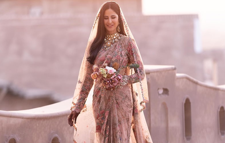 Planned by Sabyasachi, Katrina, as a bride, wore a red and golden lehenga which was affectionately and carefully made by the artisans. The house of Sabyasachi focussed on Punjabi roots, quality craftsmanship, legacy, innovativeness, and royalty for Katrina Kaif’s enormous day. The outfit was seen with heavy Zari work in handwoven matka silk fabric. The tilla work and heavy zardozi borders added to the charm and royalty of the stunning bridal outfit of the diva.