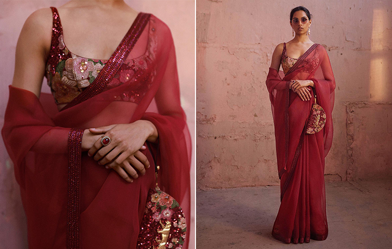 If you have an ethereal design and artistic vision in mind, then this saree will definitely meet your dreams. The strong, sophisticated, and confident women who wish to have modernity blended with timelessness must embrace the saree for its creativity. The organza red saree with embroidered blouse beautifully describes Sabyasachi’s signature aesthetics. So, if you are a die-hard fan of the brand and the ace designer, here is your way to pay homage.