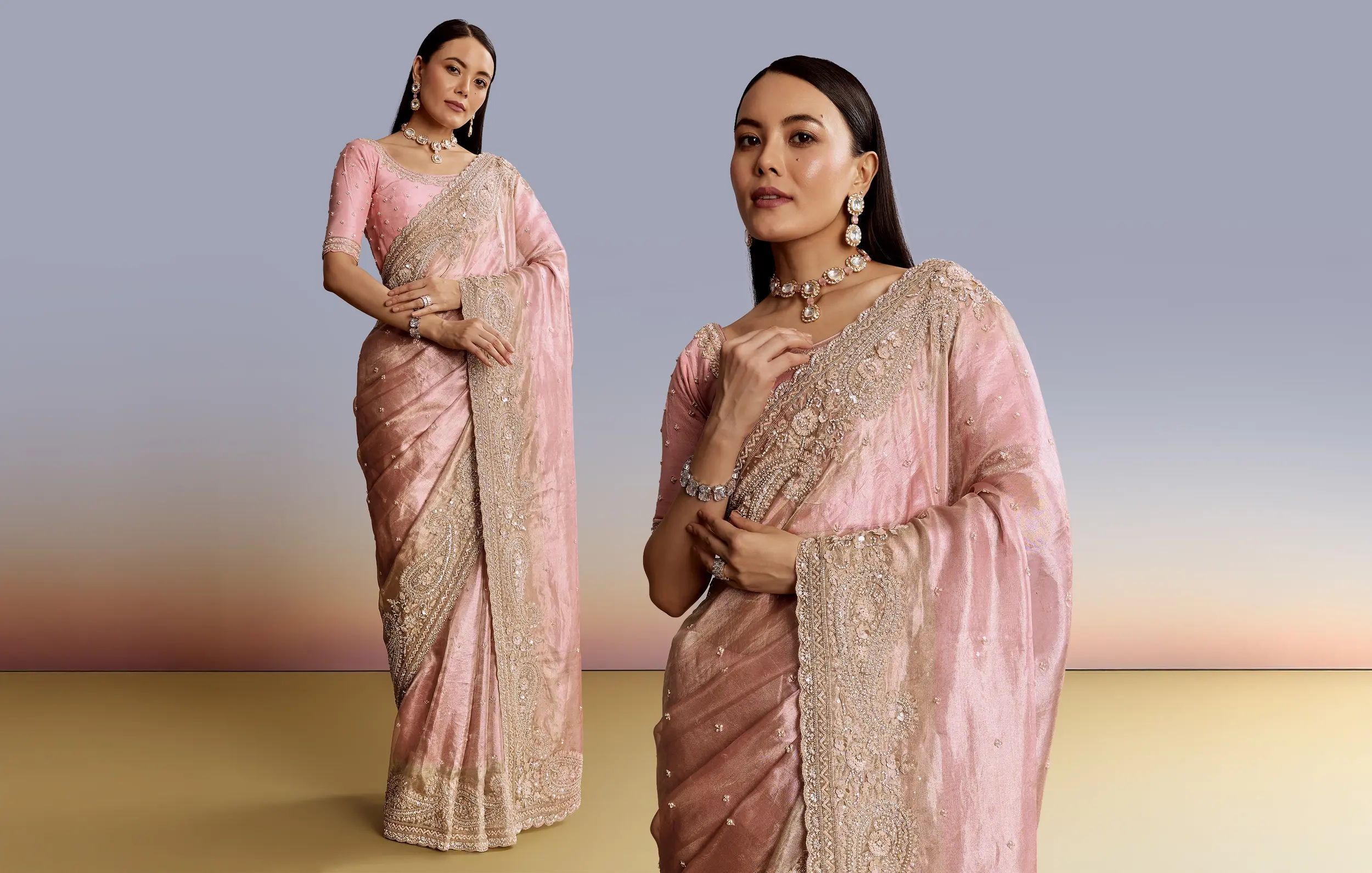 A soft pink saree offers a romantic and feminine base for a heavy wedding look and complements Indian jewellery in a matchless way.