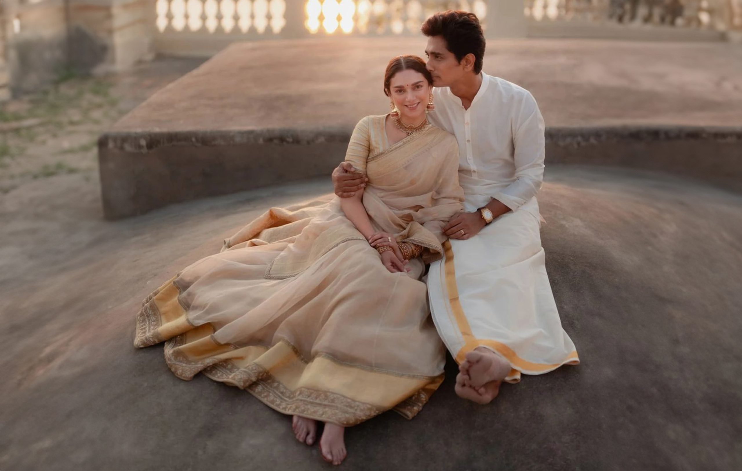 Siddharth stuck to tradition and simplicity with a classic kurta with subtle embroidery paired with traditional Veshti. He followed South Indian customs and coordinated with Aditi Rao Hydari’s lehenga look in muted tones.
