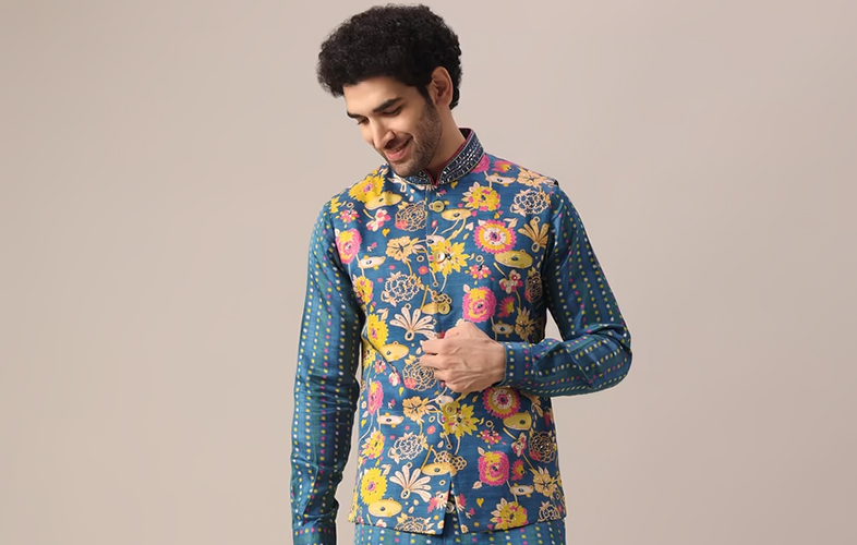 Floral prints are very energising and attractive and are thus a popular choice for sarees, suits, shawls etc amongst women. Well, the fashion-conscious men folk are also seen wearing floral prints these days to make a striking impression. The blue floral printed kurta pajama with jacket in silk with a mandarin collar is perfect for festivals and pre-wedding celebrations and will add a pop to your wardrobe.