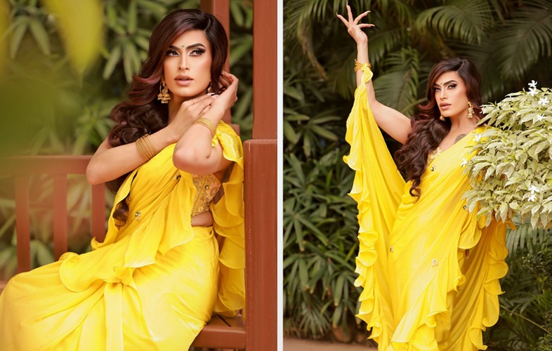 A saree is a timeless female garment that deserves and finds a place in all ladies’ closet. But Sushant Divgikr, one of the most prominent personalities and a model-actor who belongs to a trans community is making us proud by donning an appealing yellow saree. Being an actor, model, singer and now a fashionista as well; he dons many hats. Wearing a beautiful ruffle saree from Kalki, he is giving all the stylish ladies a run for their money. Today, he is an imperative part of the fashion segment as well. Saying that, let’s see how he is creating a unique style statement in a modern and edgy ruffle saree.