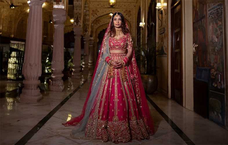 And she found it at KALKI — a stunning passion pink lehenga, embroidered with delicate floral motifs and paired with a bold, contrasting dupatta. It was soft, romantic, and modern — just like her.
