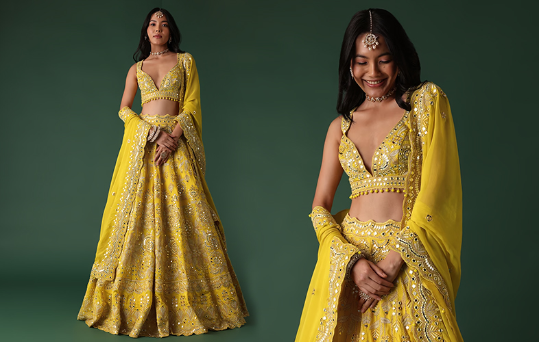 Ooze out culture, heritage, and some drama in this ethnic yellow embroidered wedding lehenga for women. The intricate resham and mirror embellishments add a touch of glamor and grandeur to the lehenga and the blouse featuring a sweetheart neckline. The soft dupatta and the bold and stylish crisscross ‘back’ are also a sneak peek into the shiny and jazzy fashion world. This mirror work lehenga choli that is shining in all its glory is the ultimate choice for weddings and Indian rituals.