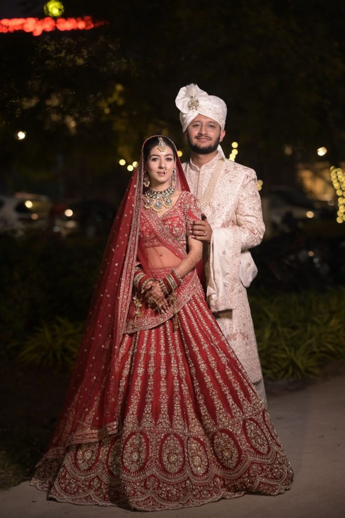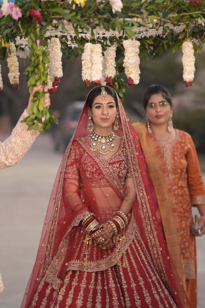 Here is a bride who didn’t just wear a lehenga, she felt it. A soft swirl of red as she twirled. A shy smile she couldn’t hide. A quiet glow that came from knowing she had stepped straight into the version of herself she had imagined for years.