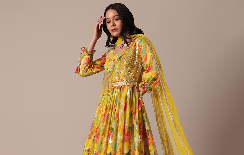 Gota patti Anarkali suits are the epitome of class, elegance, and timeless beauty. Adorned with intricate gota patti work, sequin work, and pearl embellishments make this traditional anarkali suit a perfect outfit for all celebrations and festivities. The yellow anarkali dress elegantly completed with an embroidered dupatta and a stylish belt is sure to make heads turn. Pair it with jhumkis, delicate sandals, and a clutch for an elevated look.