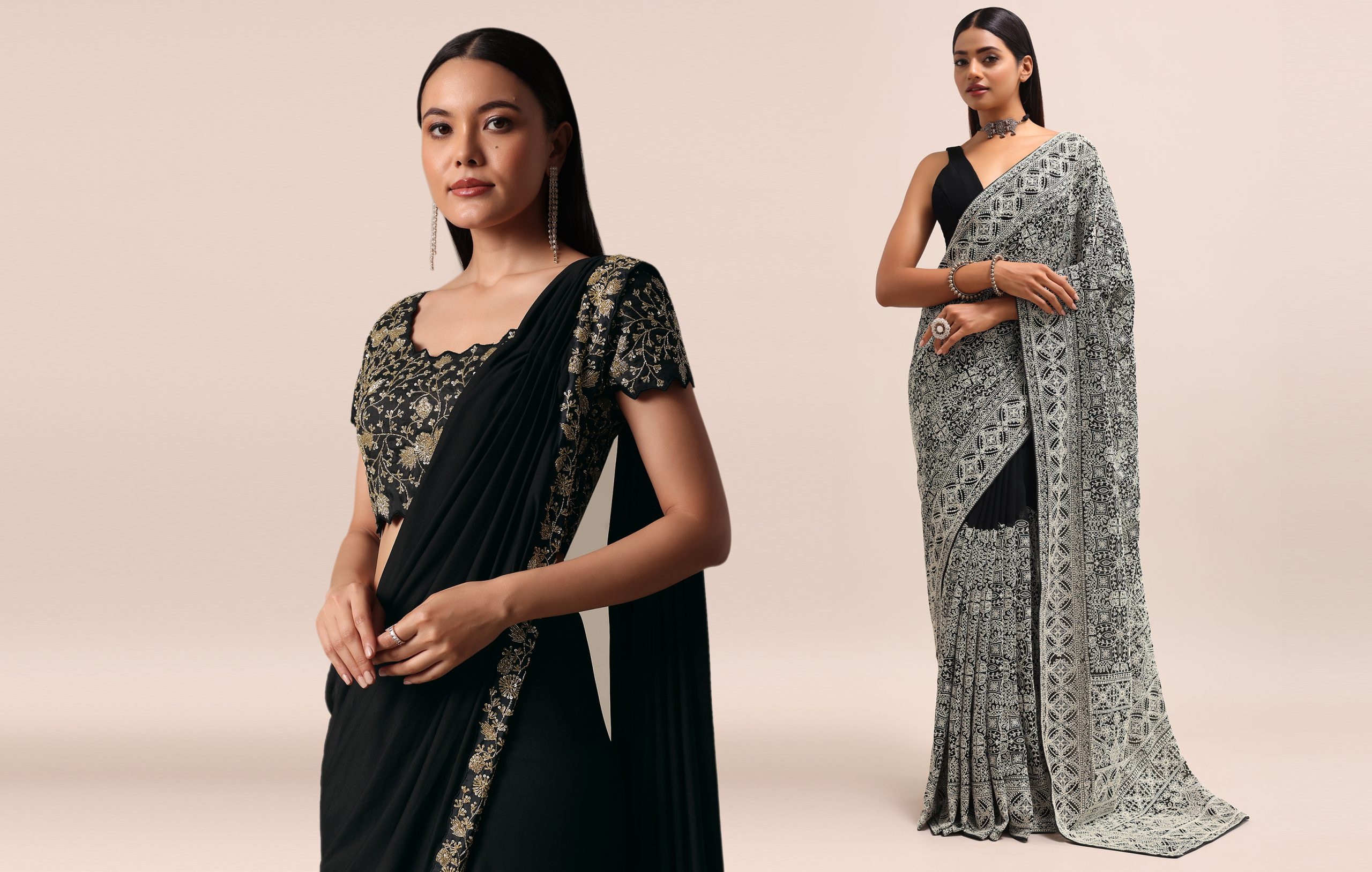 If you are looking to invest your money in an outfit that always has your back, opt for a black readymade saree that is versatile and looks stylish. If you got a last-minute invite to a party, have trouble draping sarees, or wish to look ravishing on your friend’s cocktail the black designer saree with an embellished blouse from KALKI will feel like a blessing sent from above.