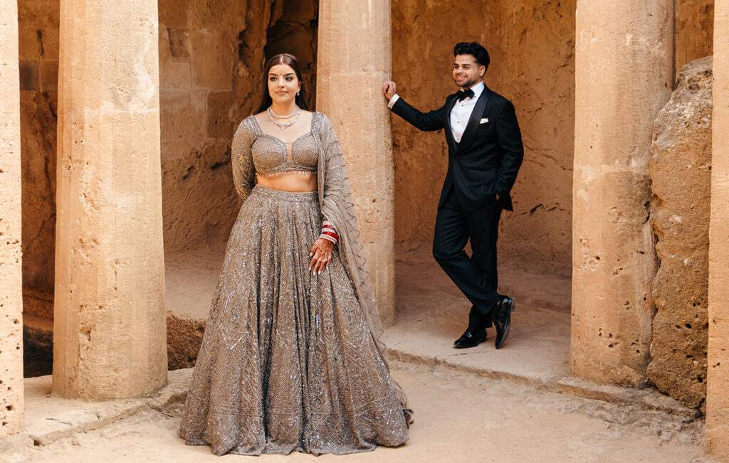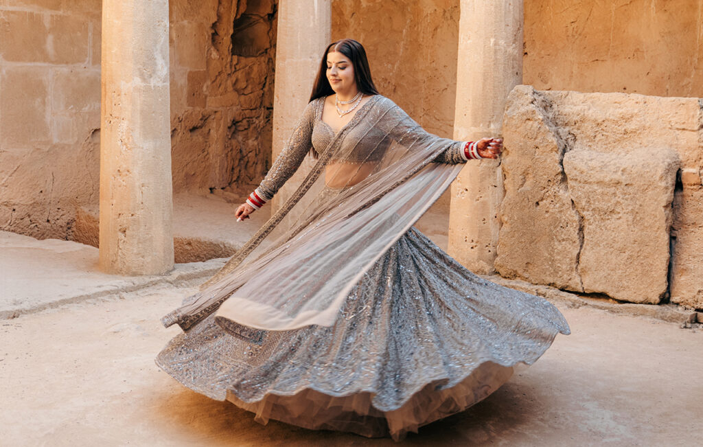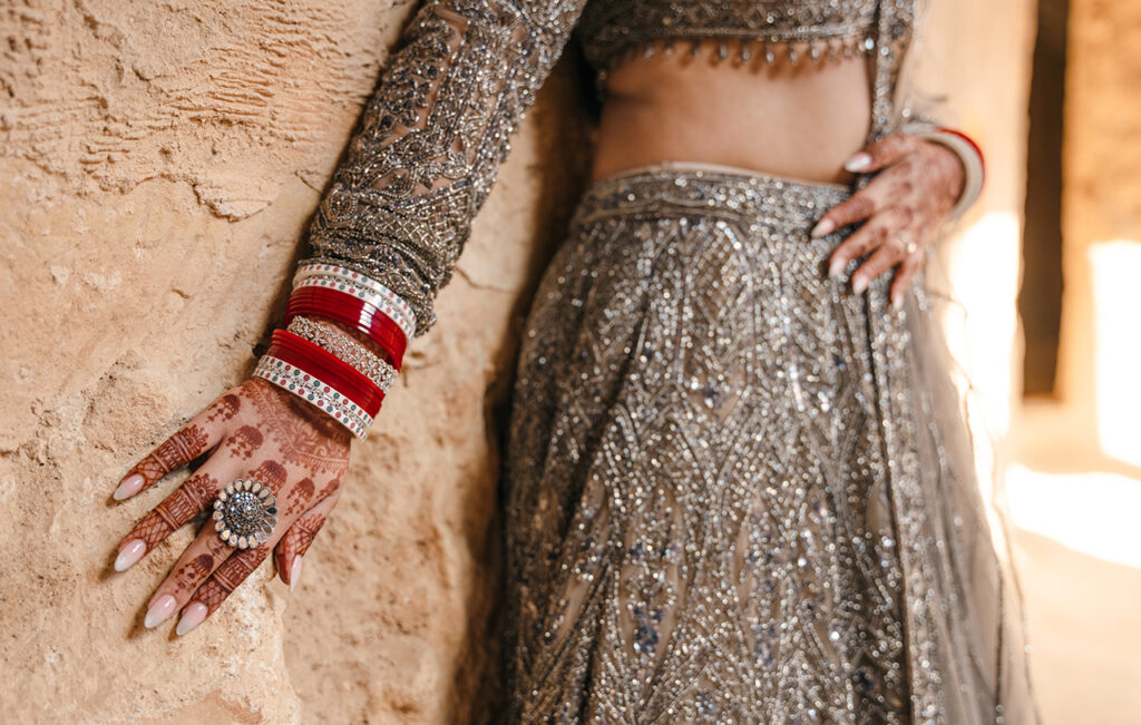 The heritage location feels like the calm before the celebration. There’s something intimate about the stone corridors and open courtyards, as though this is the space where the evening begins to take shape. The warmth of the architecture contrasts beautifully with the cooler tone of the lehenga, allowing the shimmer to stand out in a more understated, almost moody way.