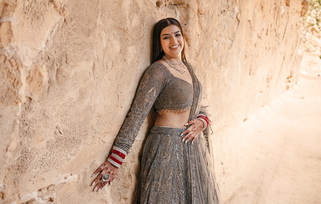 The lehenga sets the tone for the evening immediately. Moving away from traditional bridal colour, the metallic grey feels like a natural choice for a reception—refined, modern, and just the right amount of statement. It doesn’t try too hard to stand out, but ends up doing exactly that. The tone shifts beautifully under different lighting, making it perfect for a celebration that moves from sunset into night.