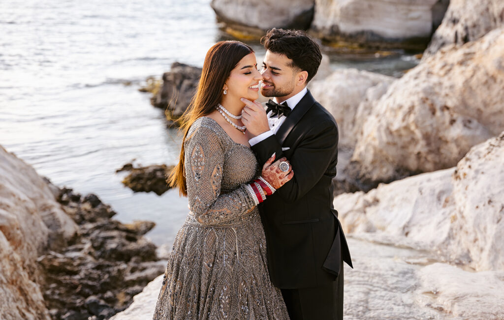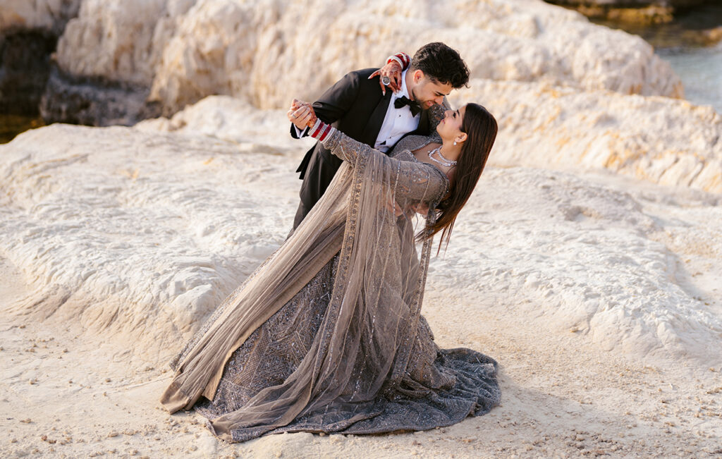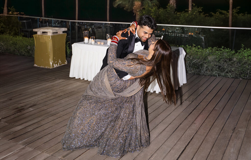 By the water, the lehenga softens. The shimmer reflects natural light instead of artificial, giving it a more diffused, almost dreamlike quality. It’s a reminder that a reception look doesn’t have to be confined to a ballroom—it can exist just as beautifully in open, unexpected spaces.