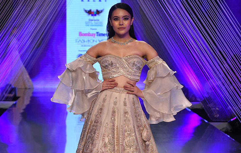 The light pink crop top lehenga set in cut-dana embroidery is creating the lam vibes. All because of the elusive off-shoulder blouse pattern which is quite significant in making the look bold and hot. Boosting the sassy quotient, the layered bell-sleeves lehenga makes sense to be sported at your cocktail parties or even reception.