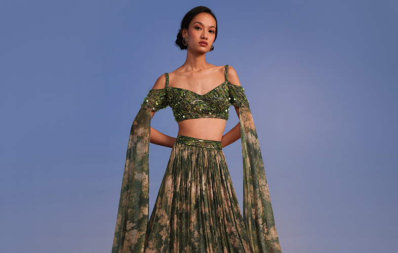 You can play a showstopper just like models, celebs and influencers at your friend’s or your own wedding in a designer dark green lehenga. New, unusual and breaking the stereotype; a designer lehenga remains fuss-free, comfy and glam for the bridesmaids. You can be too spoiled for choice to ace the bridesmaid fashion for this season. This olive green lehenga set in floral prints and crushed fabric is something that we are totally crushing over.