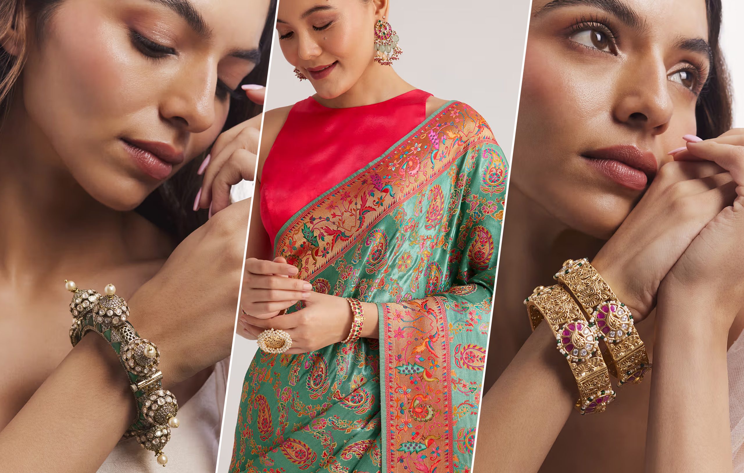 How could one not be intrigued by bangles on a saree, the sight of bangles adorning a wrist against the backdrop of a saree is undeniably captivating. This two-piece combo is the ultimate luxury divine you could ask for. While traditional bangles naturally complement classic saree styles, if you are a modern babe who loves a contemporary look you can pair these bangle styles with a unique and striking element to explore.