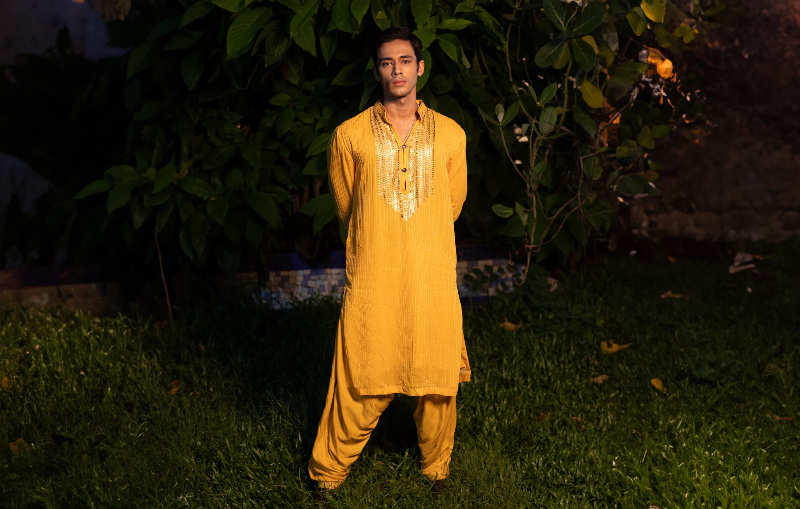 Festivals are all about hustle bustle, bling, and all things vibrant. A kurta jacket set which is an uber comfortable attire and allows you to participate in the festivities with ease is a must-have in your wardrobe. Performing holy rituals, dancing, making merry along with looking handsome and charming, all can be done without any fuss by embracing a kurta jacket set. Complete your look with a pair of juttis and a watch with this bright yellow kurta set from KALKI, and make heads turn.