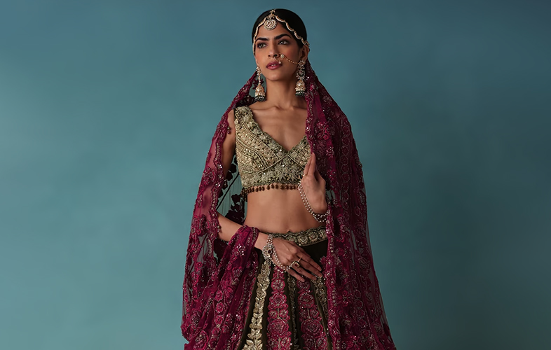 Based on artisanship and heritage value and interpreted in a contemporary style is this royal and opulent lehenga. The lehenga with a luxe fabric, velvet, and heavy embroidery style appeals to the evolved sartorial taste of modern brides-to-be. The weaving technique, embroidery, and vibrant hue of the velvet fabric not only preserve the rich tradition and craftsmanship of Indian embroidery and textile but also transfer it from one generation to the next.
