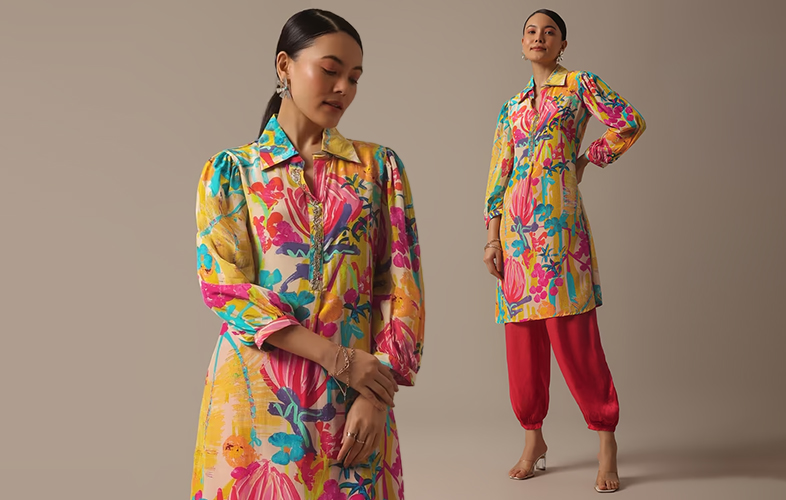 Who would have thought that the staple salwar suit would become a rage after it was adorned by Rani Mukherjee in ‘Bunty Aur Babli’ and Kareena Kapoor in ‘Jab We Met’? To date, kurtas with different kinds of salwars like dhoti salwar, Patiala salwar etc are the go-to attire for many Indian women. Be it a religious ceremony, a mehendi party, a casual day out, or any kind of festivities salwar suits will always have your back. This impressive suit set from KALKI can be worn at all formal events and makes you look impressive.