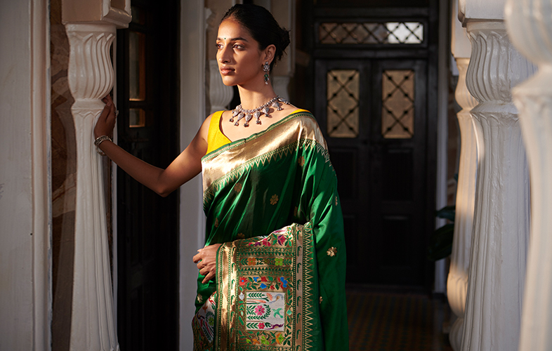 Every Indian festival, wedding and ritual is incomplete without a Banarasi silk saree. The saree that is six yards of elegance is an embodiment of grandeur and royalty for its rich and luxuriant silver and gold butti weave. The kadhwa weave is offering artistry and allure to the saree and makes the saree look ethereal. The flamboyant appeal of the saree turns the saree into a wedding number and bridal piece.