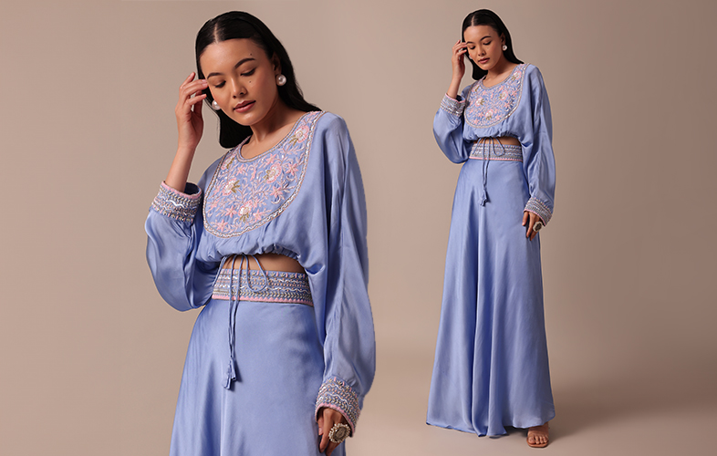 Satin is a soft, glossy fabric that can accentuate your curves and make you look very royal and polished. You can opt for different kinds of suits like patiala salwar suits, anarkali suits, palazzo suits etc in satin fabric and look glamorous at weddings, festivals, housewarming parties, mehendi parties, cocktails etc. The blue embroidered crop top and palazzo set in satin is a mind-blowing ensemble that will make you look splendid and win you many compliments.