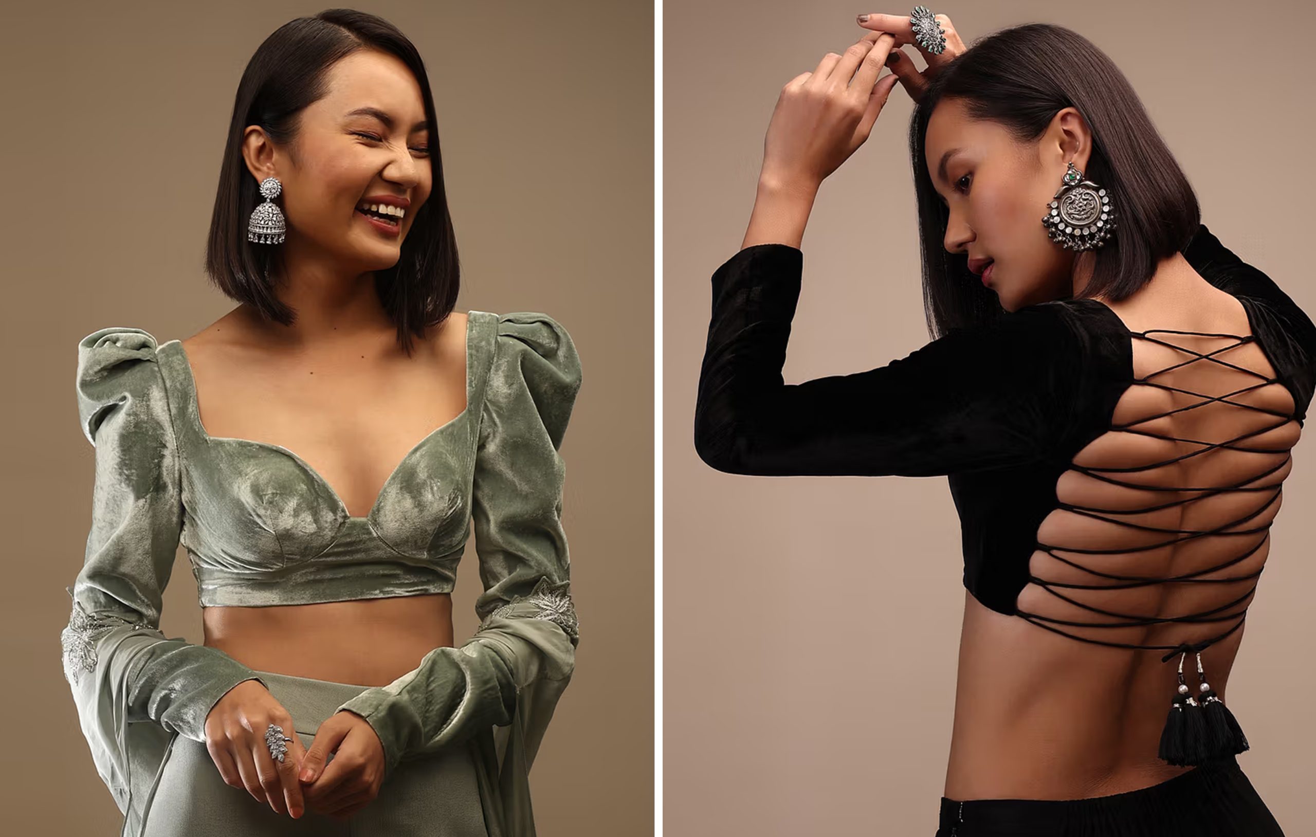 Make the velvet baby your BFF for any occasion, plus there’s a velvet blouse design for every vibe—from the ultra-modern, strappy backs to regal high-neck classics that look straight out of a period film. Let’s dive into some of the trendiest designs you’ll want in your closet right now!