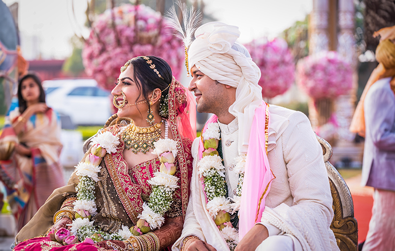 Brides often weave many dreams around their look and attire on their special day. I too wanted to ditch the traditional red bridal lehenga and opt for something unique. My dream was to find a bridal lehenga that was peppy, joyful, yet intricate and royal. And woohoo!! I found exactly what I had dreamt of. My Indian shaadi lehenga was a fusion of traditional and modern elements, embellished with intricate zardozi embroidery. It featured a unique combination of various pastel shades, highlighting the charming onion pink base. It was a classic royal that made me feel like a maharani. My bridal jewellery which consisted of a heavy necklace set with green stones, a matha patti, a maang tikka, hathphool, and an oversized nose ring made me look magnificent. The subtle make-up and perfect hairdo of a low bun completed my look and made me feel on top of the world. Daksh looked uber classy in an off-white achkan set along with matching juttis, dupatta, and a turban. The green long necklace added a pop of colour to his ensemble making him look like a member of the royal family. We were so elated that we just couldn’t stop looking into each other’s eyes.
