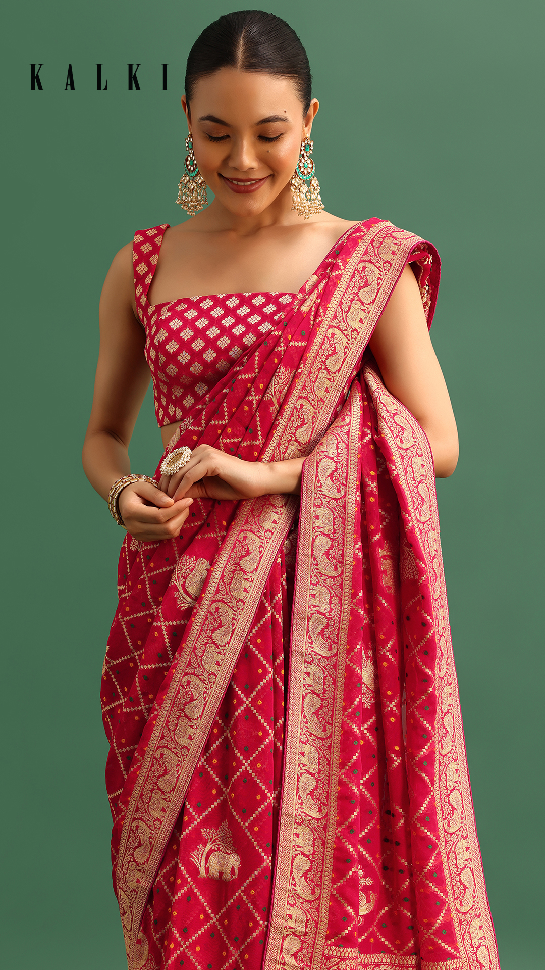 This rich and elegant Banarasi weave with delicate Bandhani work creates a stunning contrast, making it a beautiful saree for Karwa Chauth.