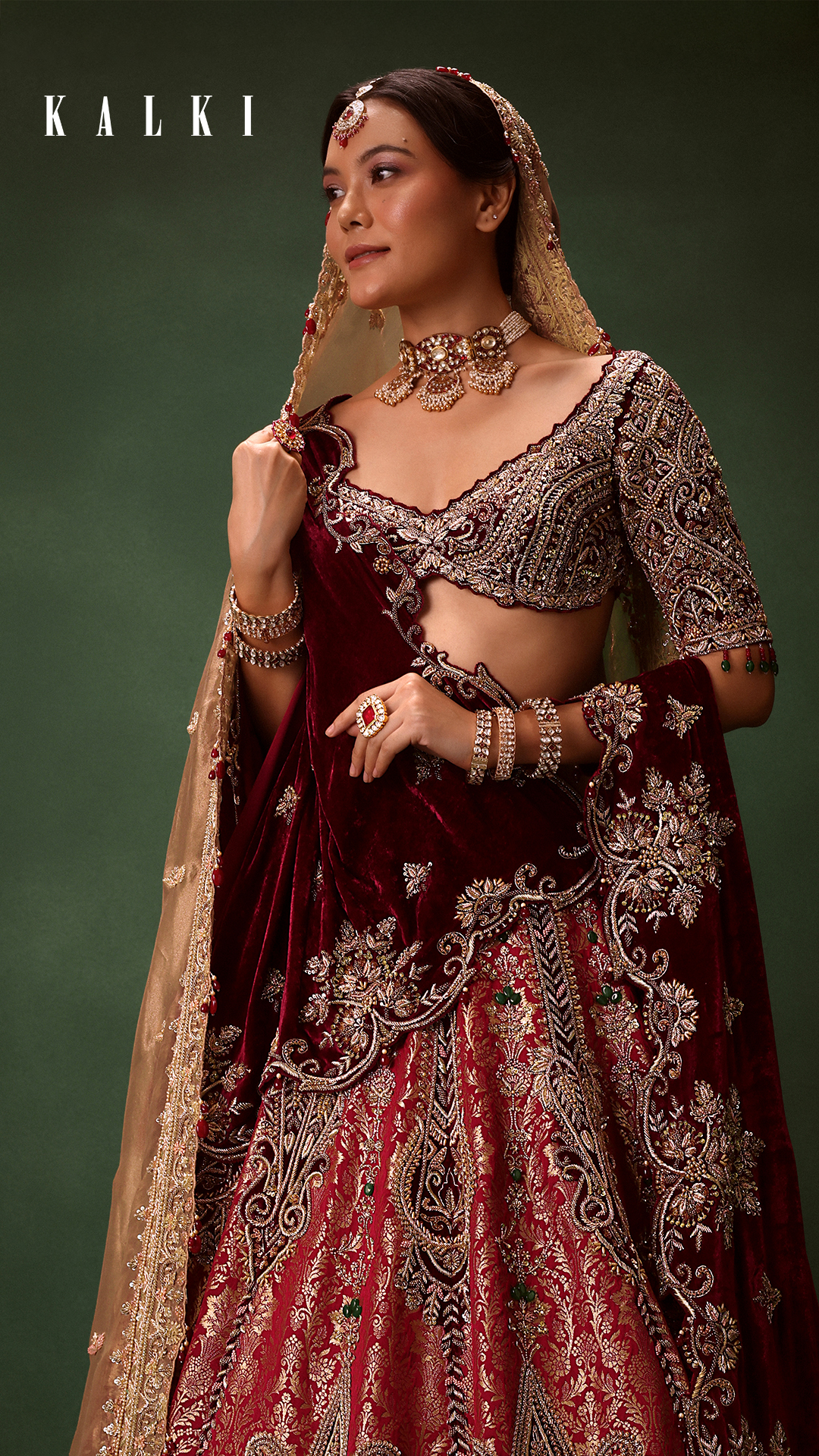A queen, swathed in pure luxury. That’s what the vibe of this butti velvet bridal lehenga dupatta style brings to the table.