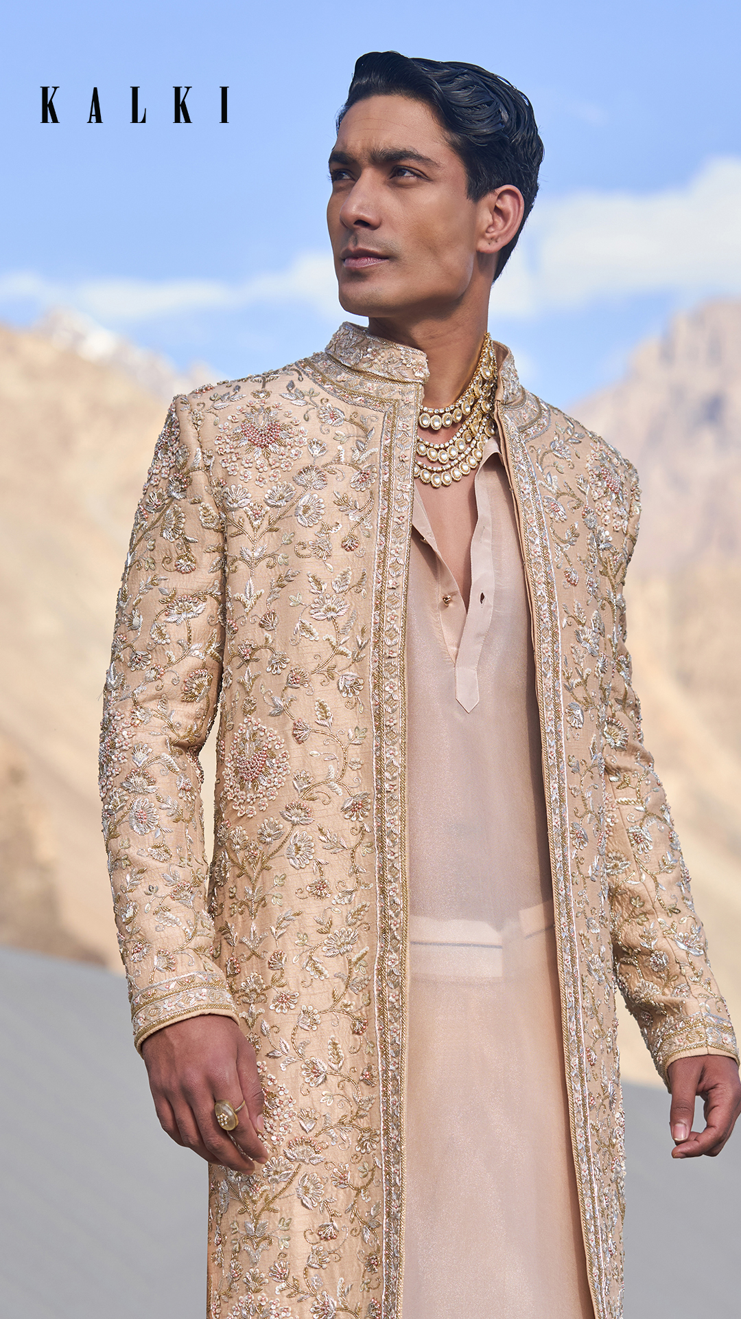 Radiate opulence in KALKI Fashion's newest bride & baraat couture in this stunning beige and gold sherwani set.
