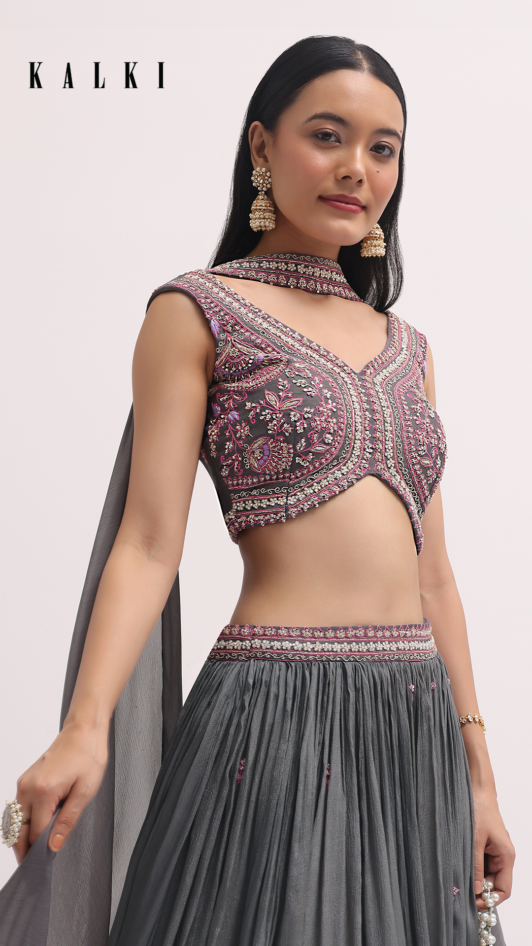 Those who wish for a subdued hue yet want a vibrancy for the festive feel must opt for this grey lehenga look featuring intricate sequins and moti work.