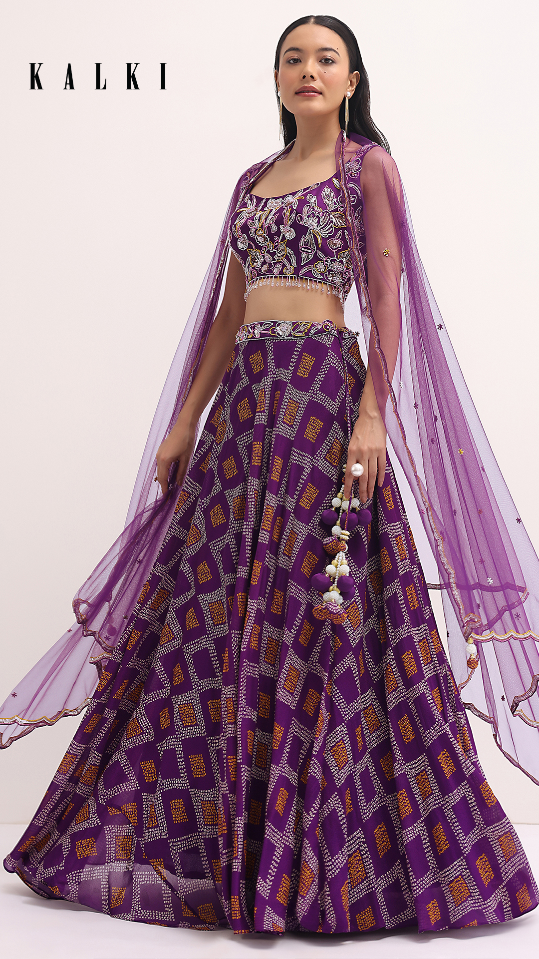 The floral work adds a festive elegance to the purple ghagra choli ensemble, perfect for garba nights.