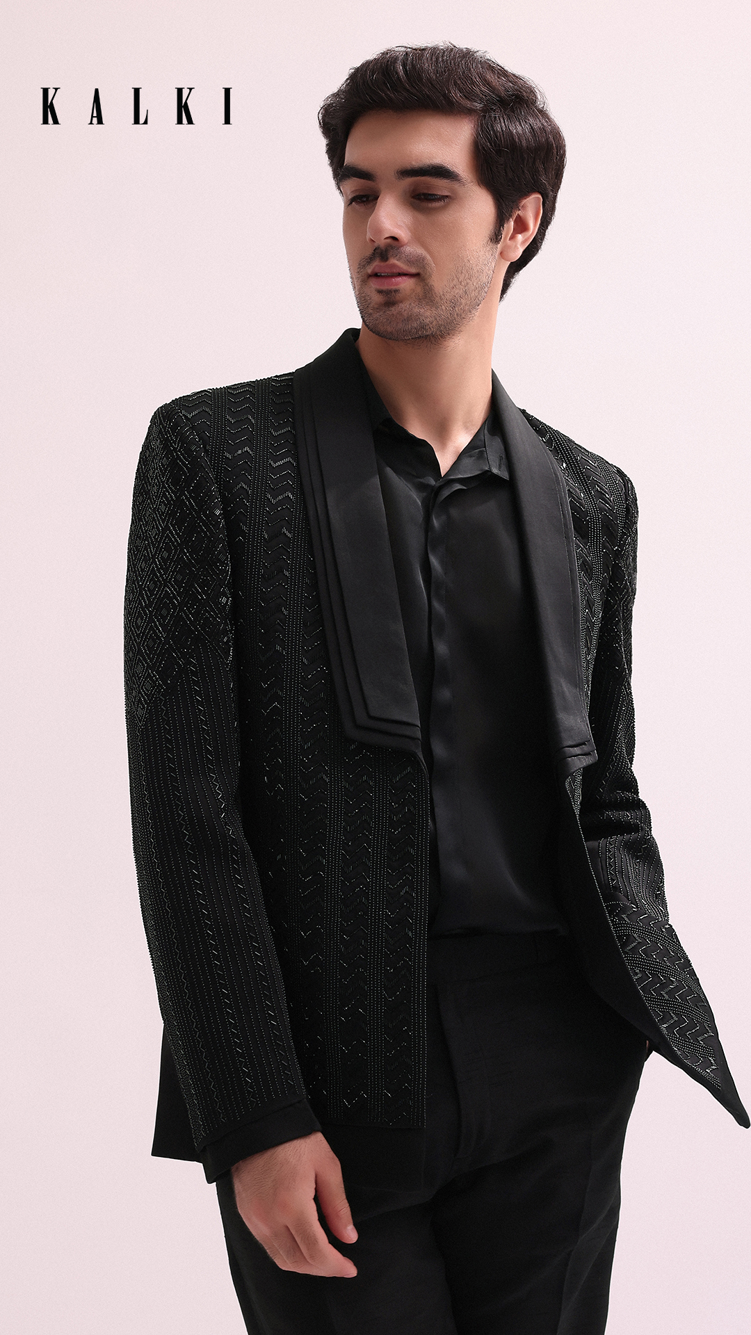 Embrace elegance in this black organza tuxedo, where hand-embellished lapels sparkle with wedding night magic.