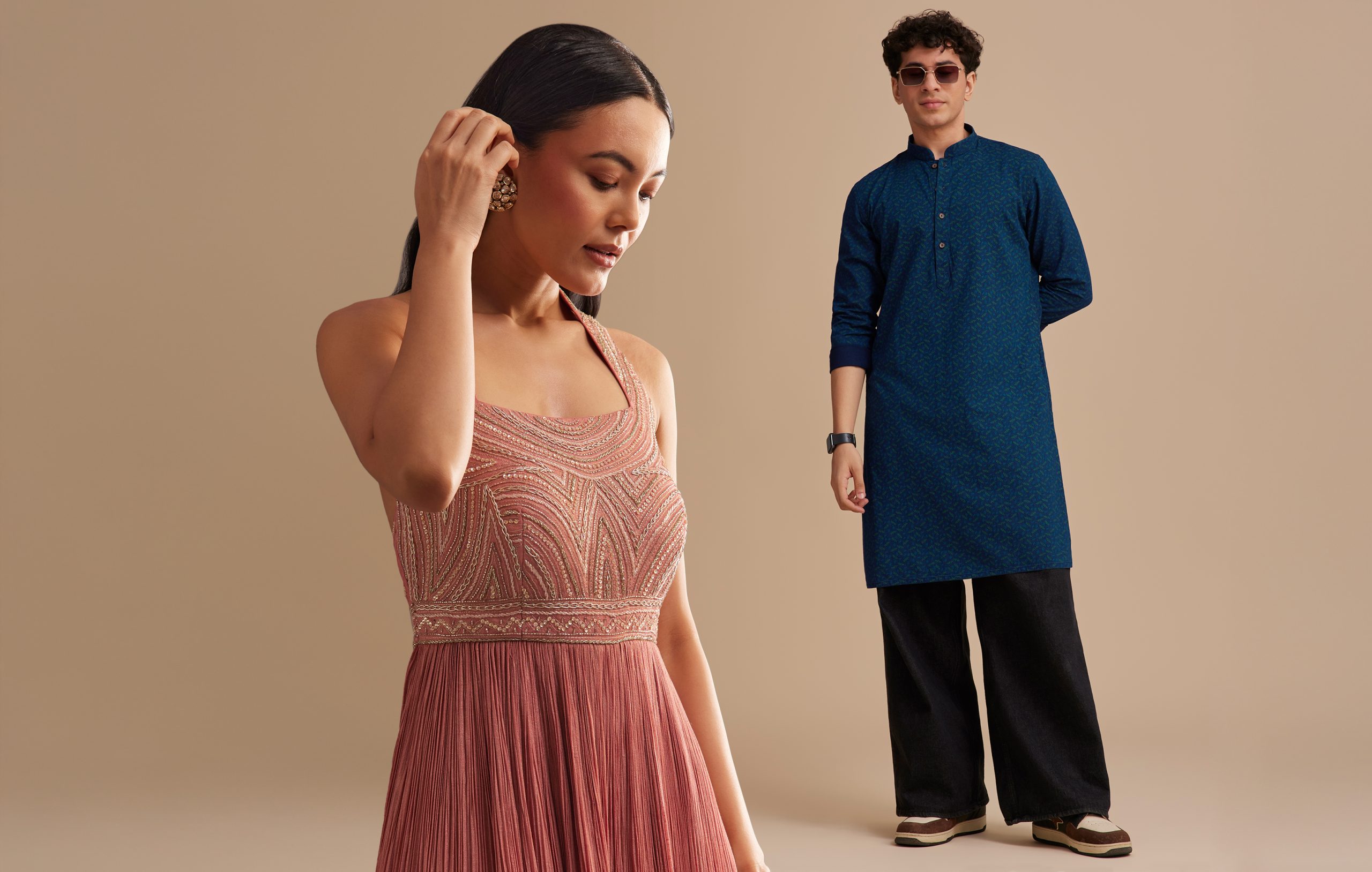 For a light but elegant beach wedding appearance, try an ombre Indo jacket set, such as the Blue to Black Ombre Indo Jacket Set. The ombre colours flow beautifully over the ocean background, while mirror and sequin details create a celebratory shine, making these ideal clothes for a beach wedding night party.