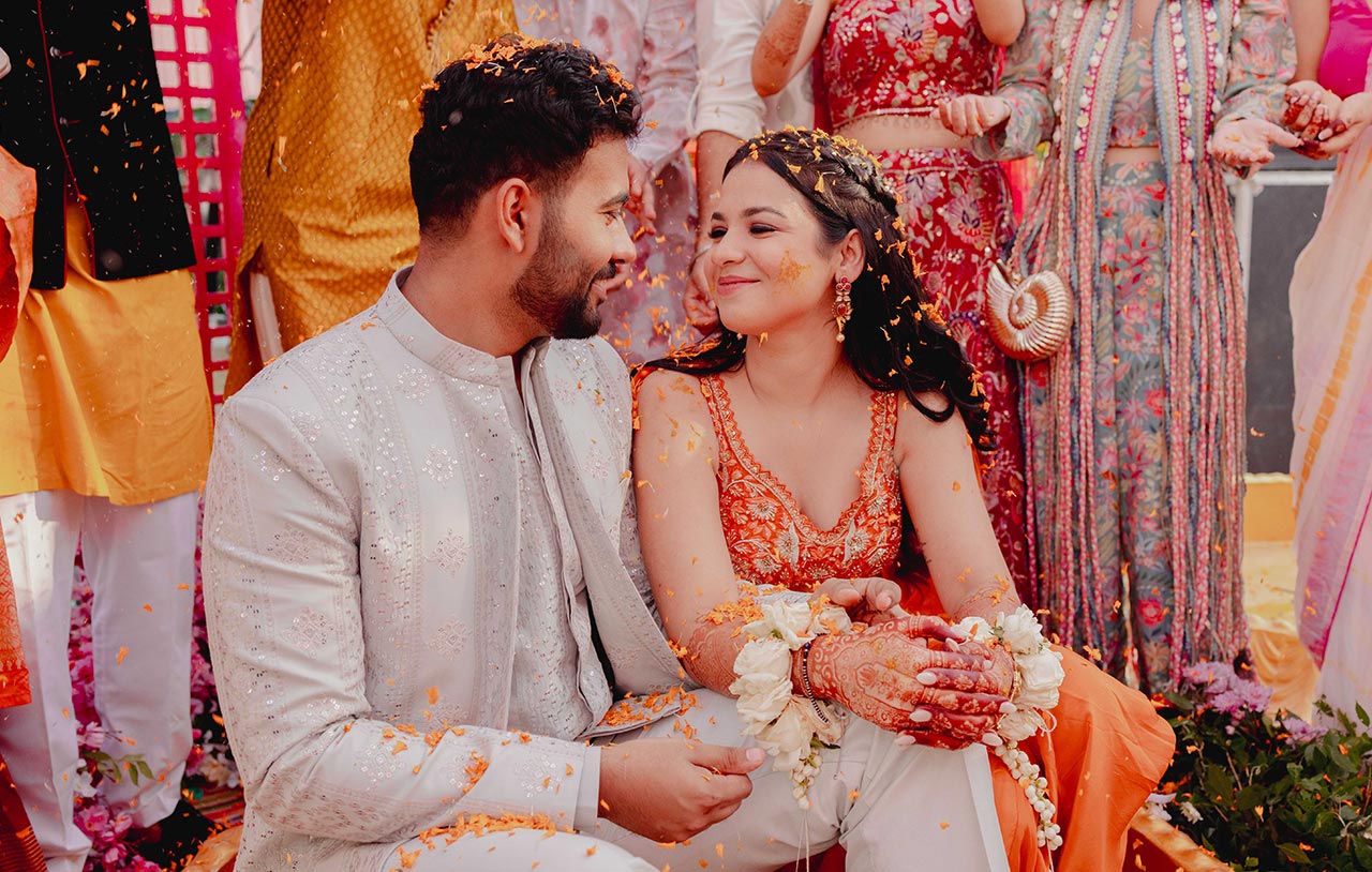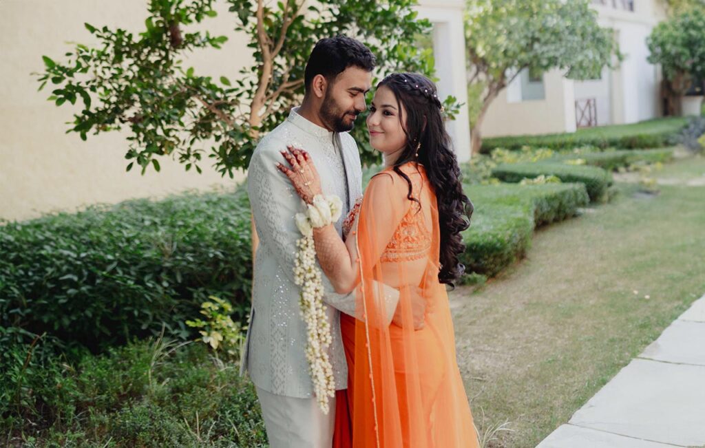 Look at her, bold, radiant, completely herself in that vibrant orange skirt set, white rose and mogra kaliras cascading down her wrists, walking hand-in-hand through the lush greens of Jim Corbett with Vipul in his cool grey whites beside her. This wasn’t just a Haldi. This was a statement.