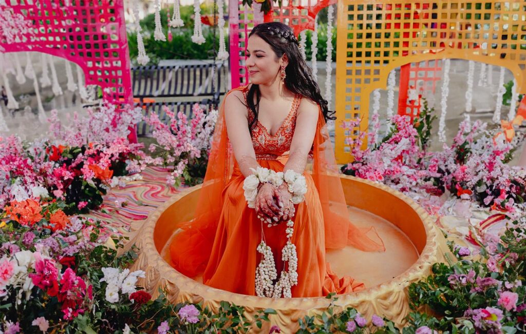 Forget flying turmeric, Vanshika chose a phoolon ki haldi, and the photos say it all. Guests wore every colour they loved. The décor was joyful and bright. And that moment with the colour powder in the air, Vanshika mid-laugh, arms wide open? Pure magic.