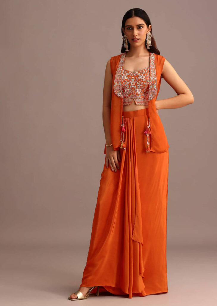 Browsing outfits from abroad wasn’t easy, but KALKI quickly became the brand she trusted. The moment she saw it, the vibrant orange skirt set with a dhoti-inspired silhouette, a chic top, and a flowing cape, it was love at first sight. No second-guessing.