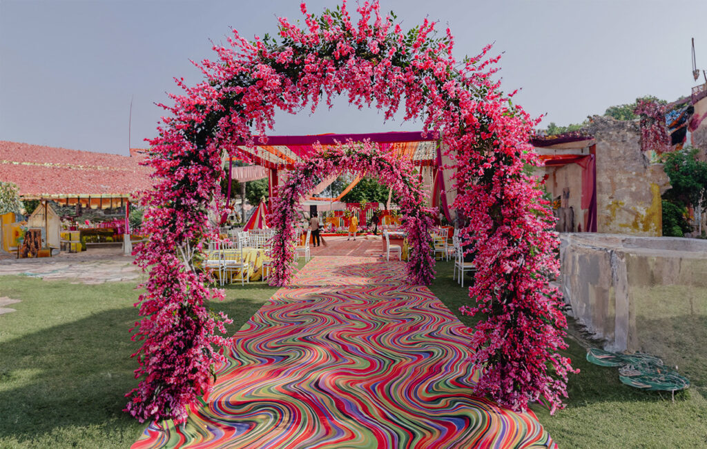 The swirling, colourful mandap floor. The lush greenery framing every couple portrait. The floral arch blazing with pinks and reds. It was dreamy — and Vanshika, in her orange, was the brightest thing in every frame.