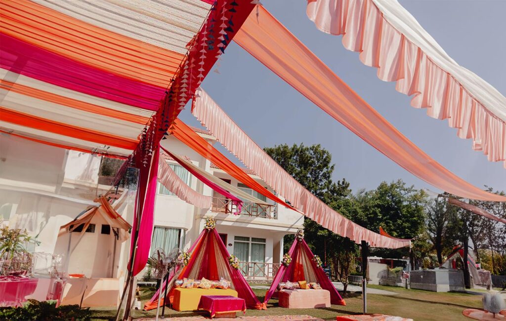 For the wedding, Vanshika had one clear vision: Jim Corbett. Close to her Uttarakhand roots, wrapped in nostalgia, surrounded by nature that makes everything feel a little more sacred. The destination wedding came alive in a boho-inspired palette of pinks, oranges, and earthy hues — and looking at those photos, it feels like the jungle itself dressed up for the occasion.