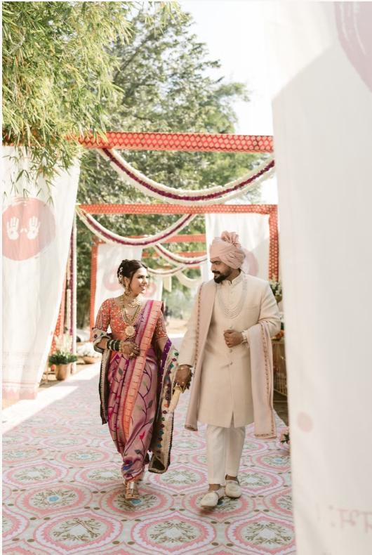 The bride’s look stood as a powerful tribute to Maharashtrian culture. Draped in a vibrant purple and pink nauvari saree, she embodied tradition in its most graceful form. The nine-yard drape moved effortlessly, its zari borders catching the light with every step. An orange embroidered blouse added warmth and contrast, bringing balance to the palette.