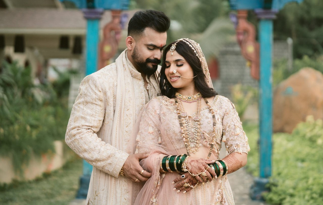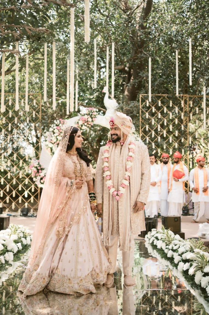 The groom’s attire echoed the same philosophy of authenticity. An ivory sherwani with subtle embroidery offered a calm counterpoint to the bride’s vibrant hues. Layered pearl malas, a soft blush turban, and an embroidered stole added ceremonial richness without excess.