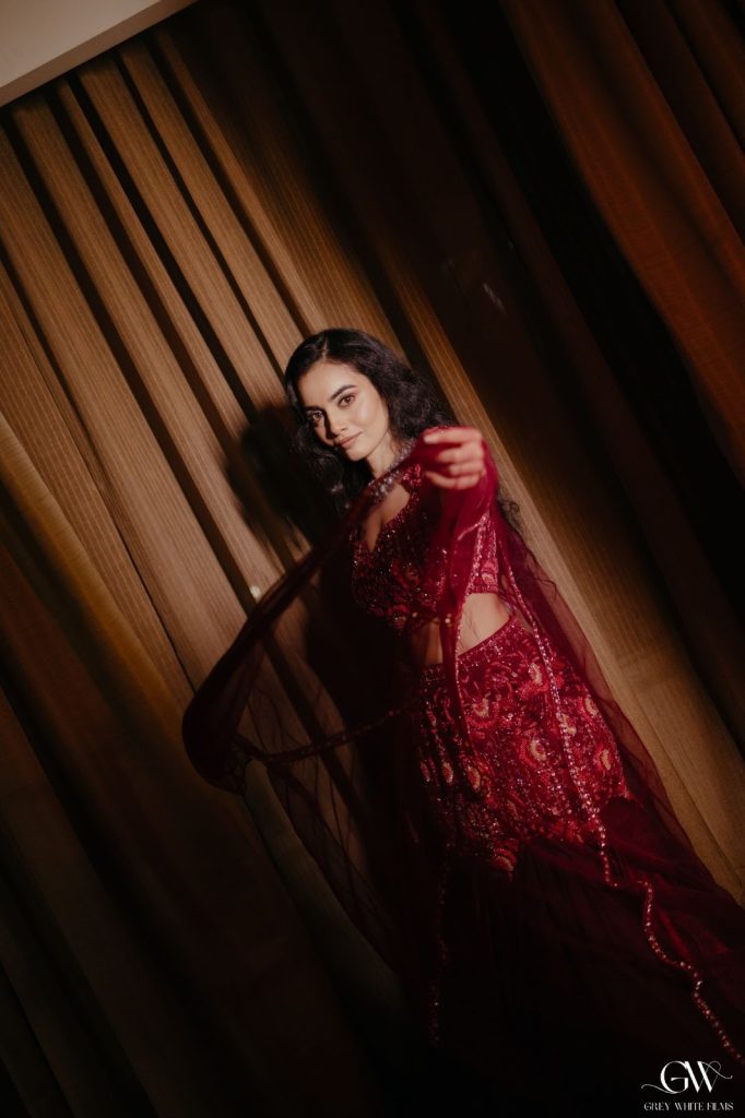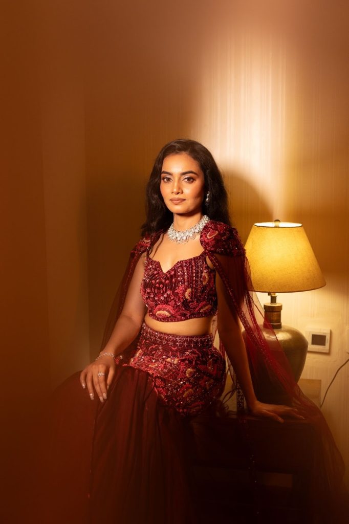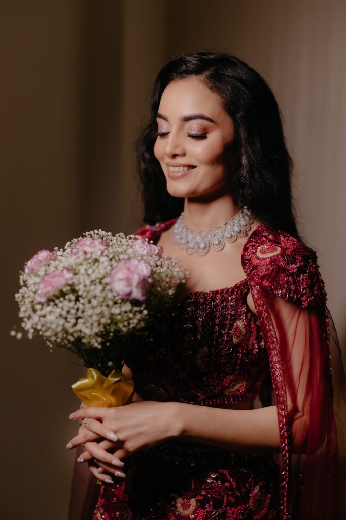 The rich maroon palette immediately evokes warmth and depth—colours often associated with love, commitment, and passion. Unlike brighter bridal reds meant for the main ceremony, this shade feels more relaxed, more personal. It is a colour that doesn’t demand attention but commands it quietly.