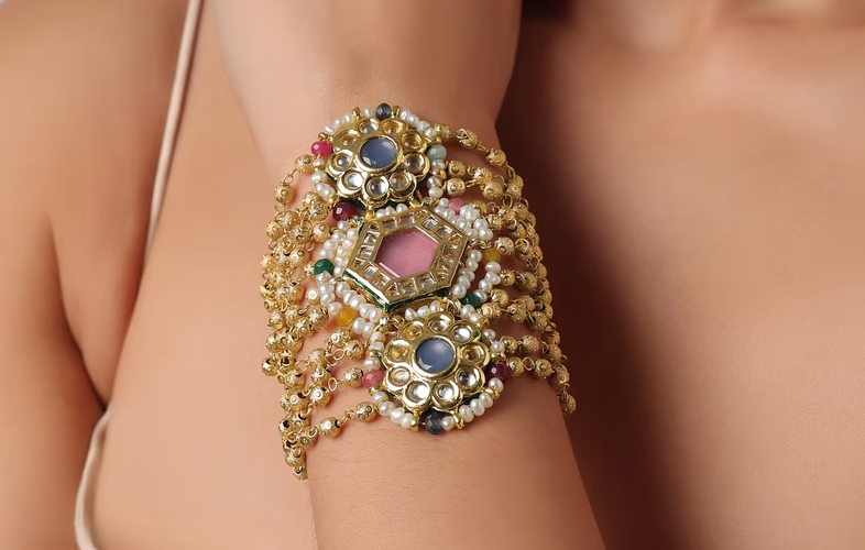 KALKI has earned a reputation for creating bridal hand jewellery that resonates with elegance and opulence. Its commitment to providing high-quality products with exquisite craftsmanship is remarkable. Whether it is a statement-making bridal party bracelets with an off-beat design to match your reception gown or an ethnic bracelet with intricate designs and precious gemstones that will match perfectly with your wedding outfit, KALKI combines traditional Indian aesthetics with modern trends. The pink stone studded layered bracelet with kundan and beads can uplift all your formal outfits and make you look classy.
